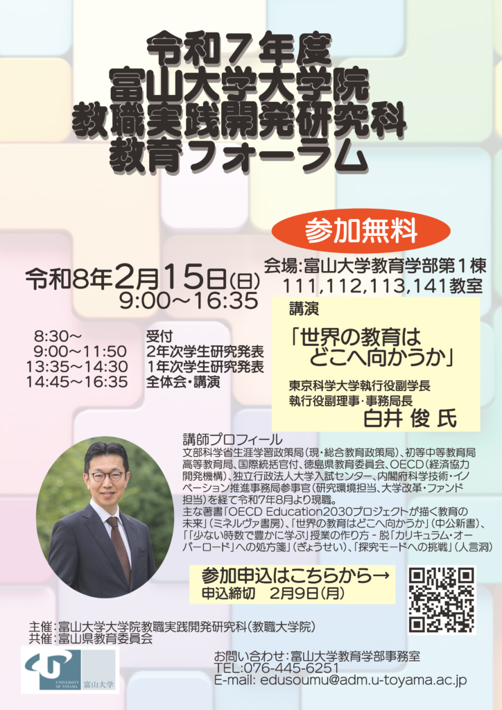令和7年度教育フォーラムを、2月15日(日)に開催いたします。 スケジュール等はパンフレットを御覧ください。