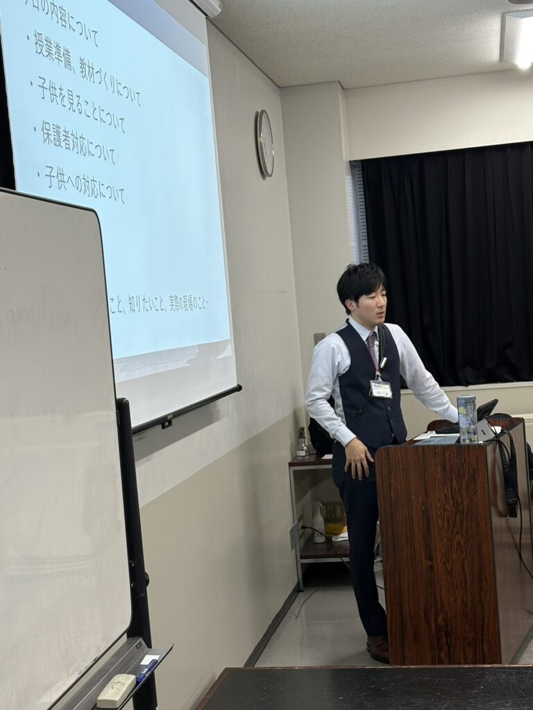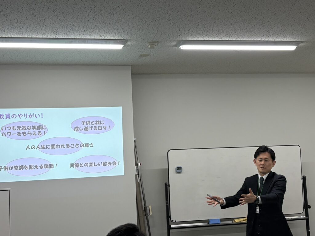 それぞれの経験や思いなどからテーマを設定し、内定者の皆さんが来年度から良い教員人生を迎えられるように演習やお話を準備しました。