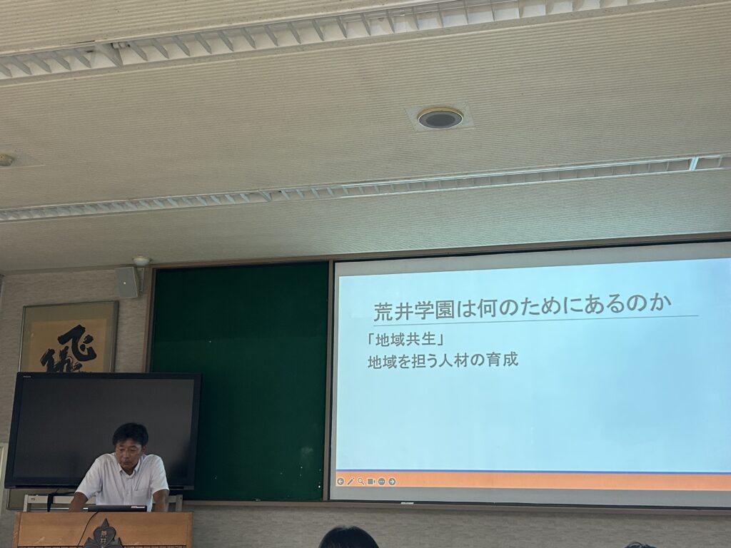 9月9日(火)に令和7年度の第2回のとみけんを実施しました。今回は荒井学園高岡向陵高等学校にお邪魔し、荒井理事長と宮袋校長からお話を聞かせていただいたり、校内を見学させていただいたりしました。生徒の居場所づくり、自分たちの人生設計等について学んだり、考えたりする機会となりました。